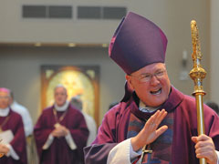 Archbishop Timothy Dolan, waves during his farewell Mass at the Cathedral of St. John the Evangelist in Milwaukee March 29, 2009, before he left for the New York archdiocese. (CNS/Compass/Sam Lucero)