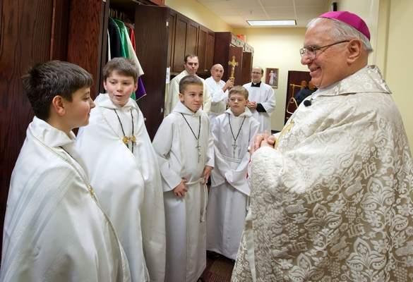 Bishop Fabian Bruskewitz, right, talks with the altar boys in the sacristy before mass. From left, they are fifth-grader Grant Bailey; sixth-grader Collin Bailey, Grant's brother; sixth-grader Nolan Lyons; and sixth-grader Zachary Otte.