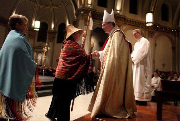 Archbishop J. Peter Sartain is welcomed to the Pacific Northwest by Kay Knott of the Upper Skagit Tribe during a Rite of Reception ceremony at Saint James Cathedral. Sartain succeeded Archbishop Alex Brunett as leader of the Archdiocese of Seattle.
