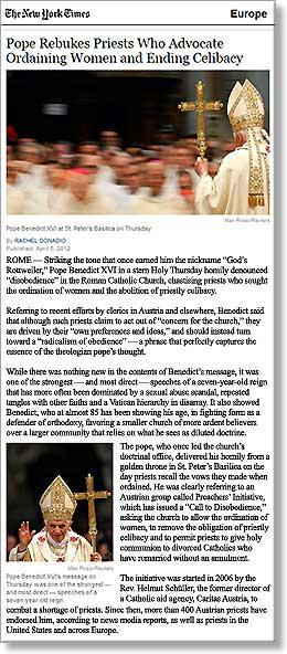 NYT "Pope Rebukes Priests Who Advocate Ordaining Women and Ending Celibacy" (April 5, 2012)
