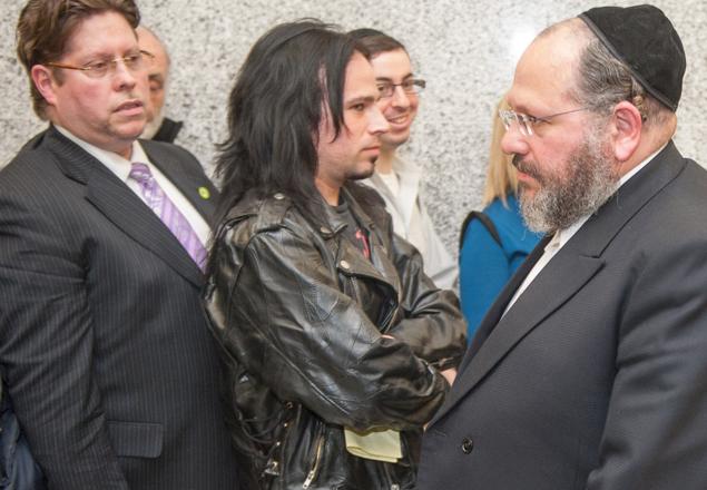 Nechemya Weberman in court Wednesday. Joey DiAngello, an advocate for abuse victims, stands in the center.