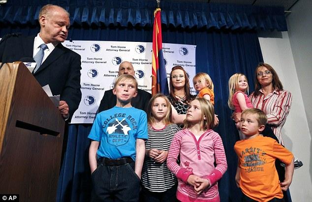 Arizona attorney general Tom Horne, left, and Ruby Jessop, rear centre, and her six children during the news conference where he announced a probe into a polygamist sect along the Utah-Arizona border