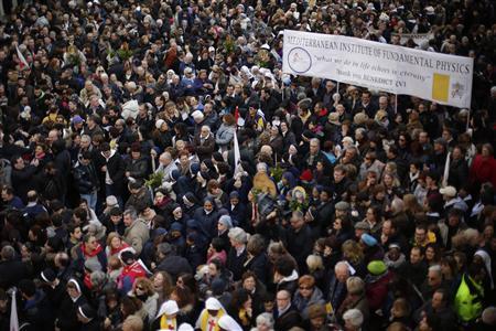 The faithful gather as they wait for Pope Benedict XVI to appear for the last time at the balcony of his summer residence in Castelgandolfo, south of Rome, February 28, 2013.