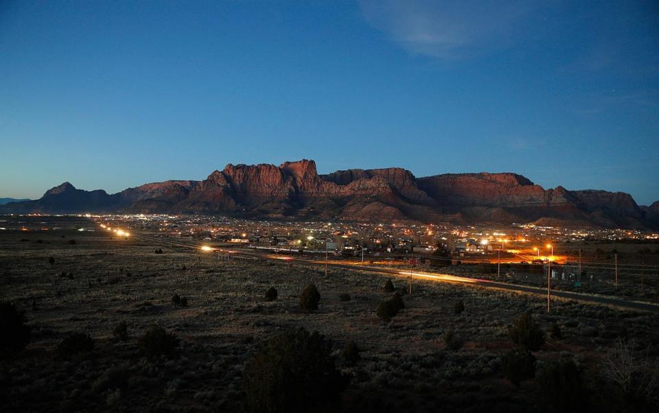 | The sun sets over the twin towns of Colorado City, Arizona and Hildale, Utah. |