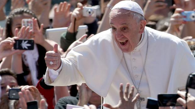 Pope Francis greets the faithful gathered for a Mass in St Peter's Square in the Vatican City with an enthusiastic thumbs up. Photo by Franco Origlia |