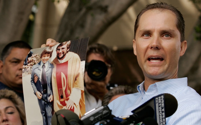 Plaintiff Lee Bashforth holds a photo of himself outside Los Angeles Superior Court on July 16, 2007, the day that the Los Angeles archdiocese and attorneys for more than 500 victims of clergy sex abuse arrived at a $660 million settlement. (AP Photo/Damian Dovarganes)