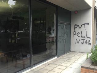The graffiti scrawled in black paint across the windows and pillars of the Melbourne archdiocese building in East Melbourne and CBD court included "child molester Pell" and "put Pell in jail for cover up".