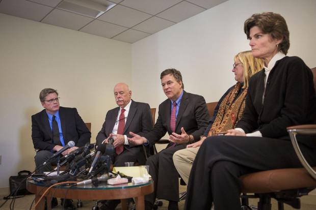 Attorney Eric MacLeish, center, answers questions from the media about the sexual abuse scandal at St. George’s School. From right to left: Harry Groome, attorney Carmen Durso, MacLeish, Katie Wales and Anne Scott. Photo by Jesse Costa |