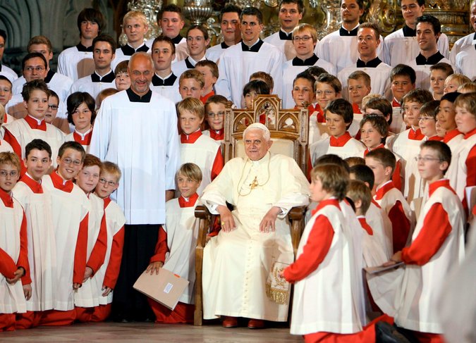 Pope Benedict XVI with the Regensburg choir in Bavaria in 2006. The former pope’s brother conducted the choir from 1964 to 1994, a period that coincides with accusations of abuse.