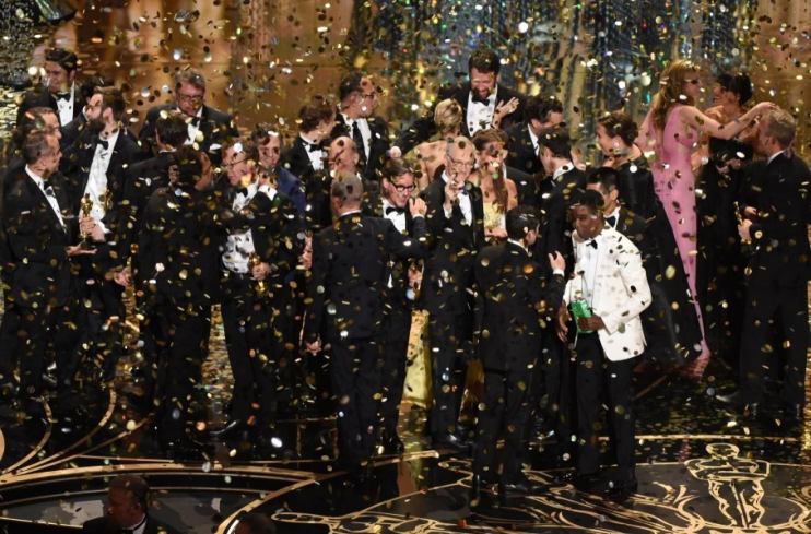 | The production team and cast of “Spotlight” celebrate the award for best picture at the 2016 Oscars ceremony. |