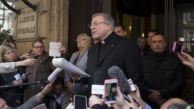 Cardinal George Pell reads a statement after a meeting at Rome's Quirinale hotel with the victims of child sex abuse on Thursday. Photo: Marco Di Lauro