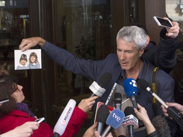 Anthony Foster, member of the Australian group of relatives and victims of priestly sex abuses, shows reporters the photo of his two daughters who were both abused by the same priest. One of them later committed suicide. Mr Foster was among the survivors who met with Australian Cardinal George Pell on Thursday March 3, 2016. (AP Photo/Riccardo De Luca)