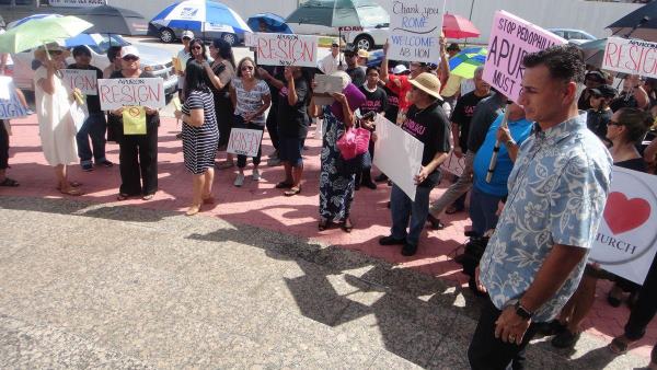 A group of Catholics calling for the resignation of Archbishop Anthony S. Apuron recently held a protest rally at the Agana Cathedral. Photo by Louella Losinio |