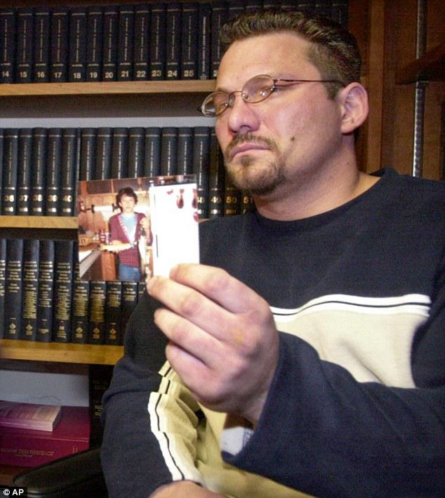 | Gegerly said a priest molested him when he was 10. He is pictured in 2003 holding an old photographed of himself while discussing his lawsuit against the priest and the diocese |