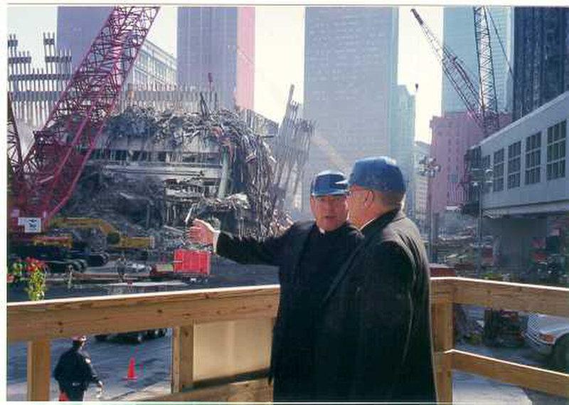 | 4 / 30 In this 2001 photo, Newark Archbishop-designate John J. Myers, left, and the archdiocese's administrator at the time, Bishop Paul Bootkoski, survey the destruction at the World Trade Center after 9/11. |