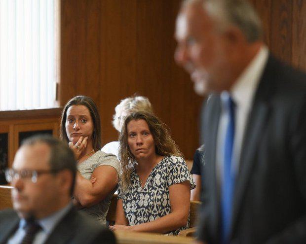 In this Friday, Aug. 19, 2016, photo, Kate Drumgoole, center, and her wife Jaclyn Vanore, rear left, listen to their attorney Eric Kleiner, right, during a court hearing in Hackensack, N.J. Drumgoole is suing Paramus Catholic High School in New Jersey, alleging the school violated the state's discrimination law when she was fired because she's married to a woman. Photo by Chris Pedota |