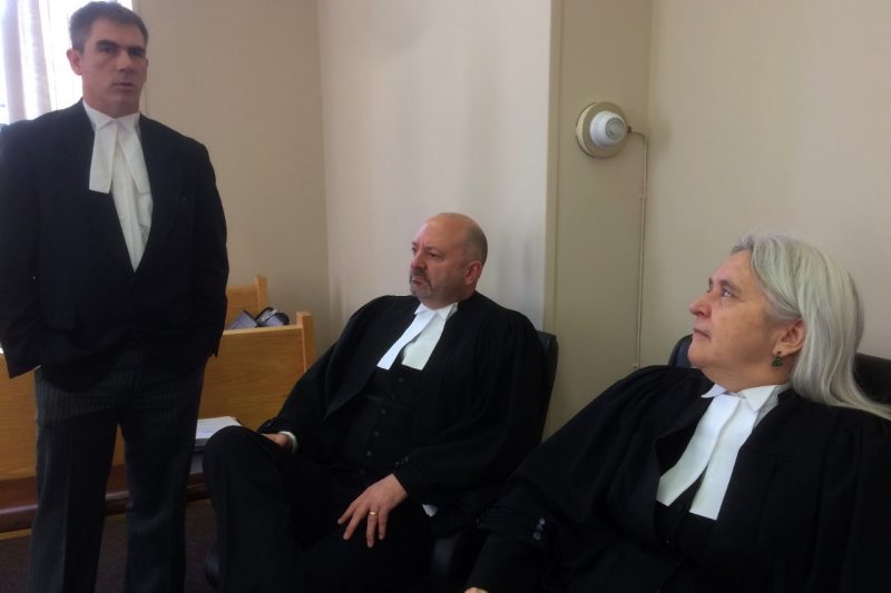 Lawyer for former orphanage residents Geoff Budden (left) chats with church lawyers Chris Blom and Susan Adam Metzler at the Mount Cashel civil trial Friday.