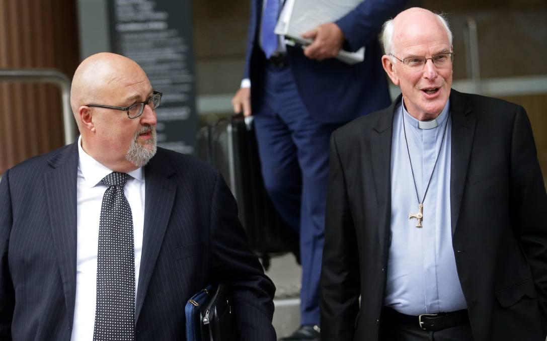 | Maitland-Newcastle Catholic Bishop Bill Wright and Zimmerman Services manager Sean Tynan leave the Royal Commission into Institutional Responses to Child Sexual Abuse hearing in Newcastle in August. |