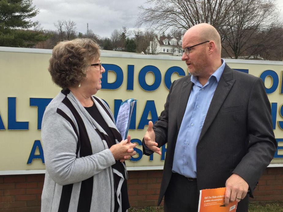 | Judy Jones (left), Midwest associate director of the Survivors Network of those Abused by Priests, and Shaun Dougherty, a reported victim of child sexual abuse, participate in an event outside the Roman Catholic Diocese of Altoona-Johnstown headquarters in Hollidaysburg, Blair County, on Wednesday, March 1, 2017. |