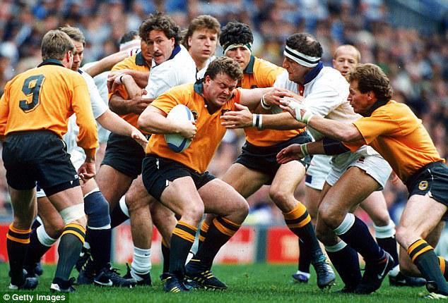 | Daly (pictured during Rugby World Cup in 1991, which Australia won) represented Australia in 41 test matches - but the horrors of his past tormented him through life after rugby union |