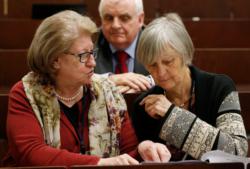 Hanna Suchocka and Dr. Catherine Bonnet, both members of the Pontifical Commission for the Protection of Minors, talk during a seminar on safeguarding children at the Pontifical Gregorian University in Rome March 23. Also pictured is commission member Bill Kilgallon. (CNS photo/Paul Haring) See SURVIVORS-LETTERS-VATICAN, ABUSE-COMMISSION-STATEMENT March 27, 2017 and VATICAN-ABUSE-SEMINAR March 23, 2017.