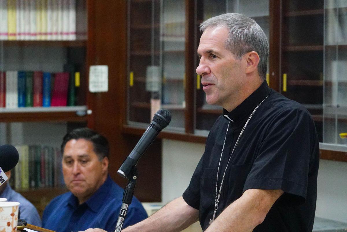 SETTLEMENT FUND: Coadjutor Archbishop Michael Byrnes held a press conference yesterday to introduce attorney Mike Caspino, seated, who will be the director of the settlement fund established for victims of sexual abuse in Guam. Photo by David Castro |