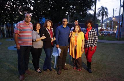 | In this Sunday, May 28, 2017 photo, former members of the Rhema Community Evangelical Ministry, from left, Marcelo Galvao Machado, Tania Machado, Naara Abe, Flavio Correa de Souza, Carlos, Rosangela Ferreira Souza, and Maria Reis, stand in a park in Franco da Rocha, Brazil, in the greater Sao Paulo area. Over the course of two decades, the U.S.-based Word of Faith Fellowship mother church took command of theirs and another congregation in Brazil, applying a strict interpretation of the Bible and enforcing it through rigorous controls and physical punishment, The Associated Press has found. |