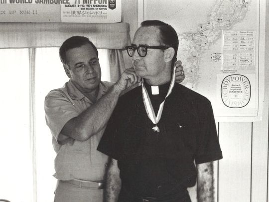 In this undated file photo, Father Louis Brouillard, right, receives a Boy Scouts of America Silver Beaver Award from Navy Capt. Leon Eisman. The award, which recognizes exceptional character and distinguished service, was the first given to a scouter on Guam. Brouillard was a scoutmaster. (Photo: Pacific Daily News)