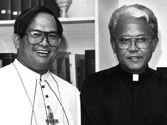 In this Nov. 27, 1987 photo, Monsignor Tomas Camacho, right, is congratulated by Archbishop Anthony Apuron, left, after being named the new bishop for the Commonwealth of the Northern Mariana Islands. (Photo: Pacific Daily News)