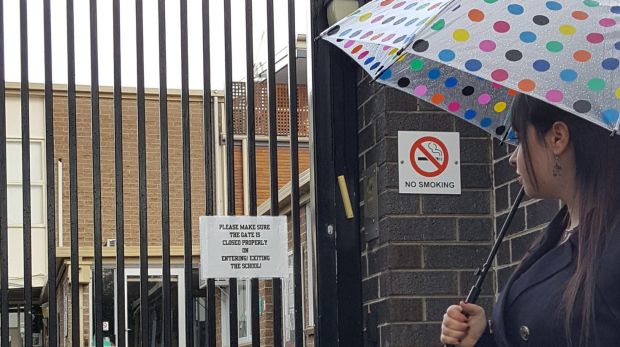 Dassi Erlich at the gates of the Adass Israel school in Elsternwick. Photo: Supplied