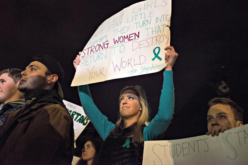 | A woman holds a sign as students gather to listen to speakers during a protest Friday at Michigan State University. |