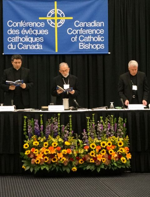 Bishop Lionel Gendron, president of the Canadian Conference of Catholic Bishops, center, is seen at the annual plenary meeting Sept. 24 in Cornwall, Ontario. (CNS/Canadian Catholic News)
