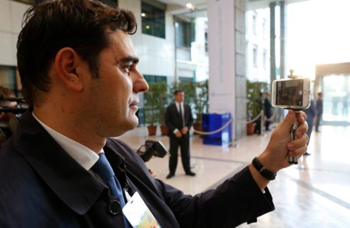 Vatican journalist Alessandro Gisotti uses an iPhone to shoot video as he waits for Pope Francis's arrival at the headquarters of the Food and Agricultural Organization of the United Nations in Rome Oct. 16, 2017. Gisotti has been appointed interim director of the Vatican press office after the resignations of Greg Burke and Paloma Garcia Ovejero. (Credit: Paul Haring/CNS.)