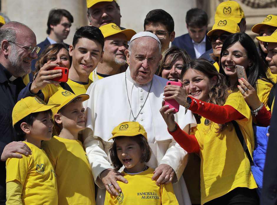 Pope Francis poses for a group photo with youths wearing shirts and holding flags of an association for the protection of abused children, at the end of his weekly general audience, in St. Peter’s Square, at the Vatican, Wednesday, May 8, 2019. Photo by Alessandra Tarantino |