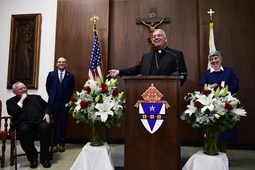 Archbishop Charles Chaput, from left, Chief Communications Officer Kevin Gavin, Archbishop-elect Nelson Perez and Sister Kathleen Schipani, IHM, laugh at a humorous moment as Perez speaks during a news conference, Thursday, Jan. 23, 2020, at the Archdiocesan Pastoral Center in Philadelphia. Perez, the bishop of Cleveland, was introduced as the new leader of the Archdiocese of Philadelphia, making him the first Hispanic archbishop to lead the region's 1.3 million-member flock.