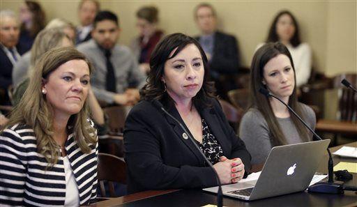 | Salt Lake City Democrat Rep. Angela Romero, center, prepares to testify as Melissa Ridgway Kraft, left, and Stephanie Pitcher look on at the Utah State Capitol on Feb. 18 in Salt Lake City. |