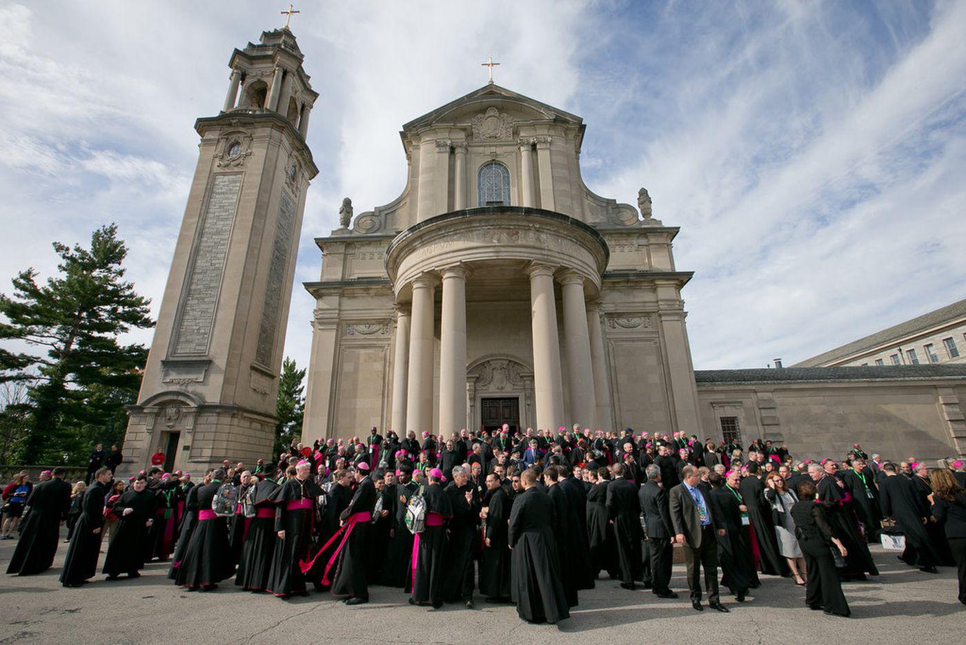 | Bishops gathered outside St. Martin's Chapel, Saint Charles Borromeo Seminary in Wynnewood, PA where Pope Francis delivered an address during his 2015 visit to Philadelphia as part of the World Meeting of Families. |