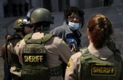 A demonstrator is detained by Los Angeles Sheriff's Department officers during a June 3, 2020, protest in L.A. in response to the May 25 death of George Floyd -- an unarmed black man said to have spent several minutes under a Minnesota police officer's knee before becoming unconscious. Photo by Patrick T. Fallon |