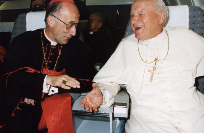 Pope John Paul II laughs while speaking with Italian Cardinal Camillo Ruini on board a papal flight in 1991. Photo by L'Osservatore Romano |