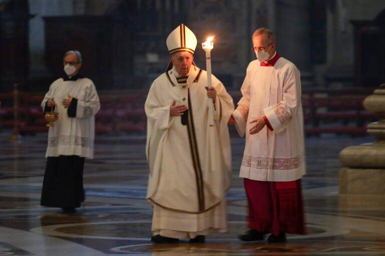 Pope Francis holds a candle as he arrives to celebrate a Mass with members of religious institutions on the occasion of the celebration of the World Day of Consecrated Life, in St. Peter's Basilica at the Vatican, on Feb. 2, 2021. Photo by Andrew Medichini |