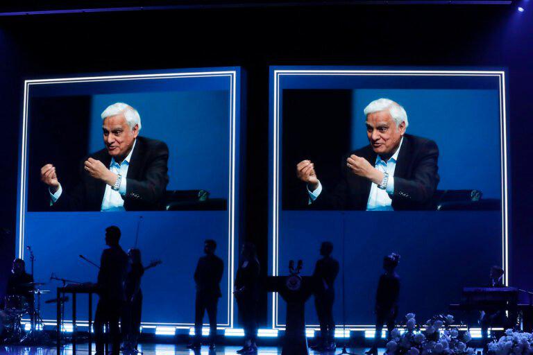 In this May 29, 2020, file photo, images of Ravi Zacharias are displayed in the Passion City Church during a memorial service for him in Atlanta. A posthumous sex scandal involving Zacharias, who founded the Ravi Zacharias International Ministries, has placed the global organization in a wrenching predicament. Photo by Brynn Anderson |