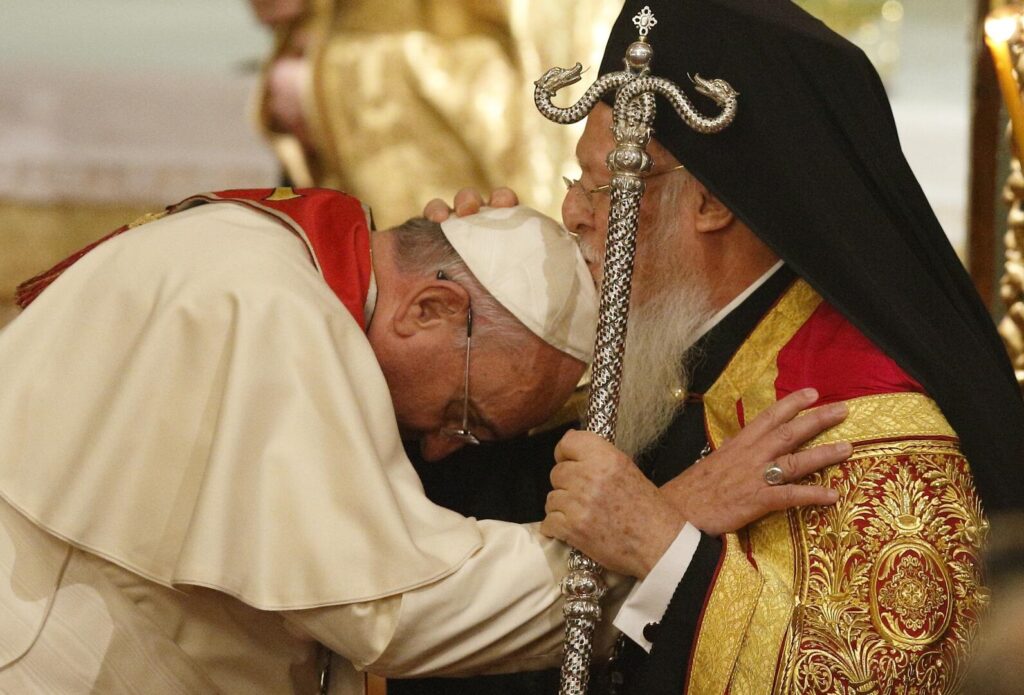 During his papal trip to Istanbul, Pope Francis asked Ecumenical Patriarch Bartholomew, the spiritual leader of Eastern Orthodox Christians, to bless him and “the church of Rome.” When he bowed for the blessing, the patriarch kissed him gently on the head.