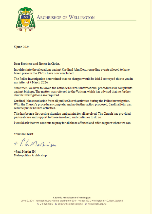 A Vatican-led review of an abuse complaint against Cardinal John Dew dating to the 1970s has concluded that no further Church inquiry is required, says the Catholic Metropolitan Archbishop, Paul Martin SM, Archbishop of Wellington.