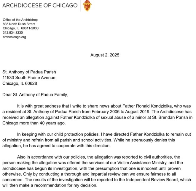 Cupich said in the letter that he told Kondziolka to remain out of ministry and refrain from all parish and school activities. Kondziolka’s most recent post was as an associate pastor at St. Veronica Parish in Flossmoor until June 2023.