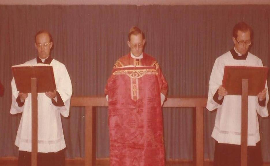Marcial Maciel, at center, in liturgical vestments, presides a ceremony, ca. 1970. Two unidentified clerics are to his flanks. Picture shared over the Legioleaks Facebook group.