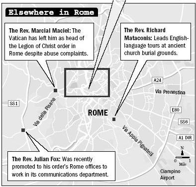 Two of his nine accusers appealed several times to the Vatican in the 1970s and 1980s, with no results. The Vatican finally agreed in 1999 to review the alleged incidents, which the men said happened in Spain and Italy when they were young boys and seminarians. But a few months later, the Vatican mysteriously suspended the inquiry without ever taking testimony from the men, according to Vows of Silence, a new book by Jason Berry and Gerald Renner, investigative journalists who first reported the Maciel saga. Alberto Athié, a former priest who had worked at a charity run by Mexico's bishops, told The News that his career stalled after he notified Mexico City Cardinal Norberto Rivera and Vatican Cardinal Joseph Ratzinger about the allegations against Father Maciel. The cardinals wouldn't comment. "I was told that Maciel was very beloved of the pope, that he had done a lot of good for the church, and that it wasn't convenient to do anything to look into the accusations," said Mr. Athié, who subsequently quit the priesthood. Father Maciel, who has repeatedly declared his innocence, continues to enjoy support from John Paul. The pope celebrated the Legion's 60th anniversary in St. Peter's Square in 2001 and told a crowd: "I extend a particularly affectionate greeting to your dear founder, Father Marcial Maciel, whom I heartily congratulate at this significant juncture." 'Lost in the crowd' The sidewalks and streets around the Vatican are brimming with clergy, seminarians and Catholic pilgrims of all nationalities. Cardinals and bishops, in their scarlet and purple vestments, meander through the scores of people. Police cars whiz by occasionally, escorting limousines with foreign dignitaries into the Vatican. "You can stand out there in St. Peter's Square and hear 50 languages spoken. You're just lost in the crowd," said Monsignor Breslin, the former college administrator in Rome. "No one will look at you and think you're a criminal." One sunny day this summer, the Rev. James Tully navigated his way past tourists in St. Peter's Square without interruption and headed for a yellow Vatican postal box on the side of St. Peter's Basilica, where the pope regularly blesses the faithful. Father Tully dropped in a couple of letters, then walked on to a nearby bus stop. Father Tully, who declined to be interviewed, was moved to Rome two years ago, about a month after he was accused of sexual misconduct for the third time. The priest had pleaded no contest to disorderly conduct in 1992 for giving three boys alcohol and grabbing one of them on the inner thigh during a baseball game in Milwaukee. Father Tully's therapist wrote a letter during that case in which he said the priest "had never denied responsibility for his sexual behavior." An official with Father Tully's Xaverian Missionary Fathers order said his transfer to Rome had nothing to do with abuse allegations. The priest was recovering from the stress of working in war-torn parts of Africa, the official said, and was not ready for parish ministry in the United States. A few miles south of the Vatican, the Rev. Richard Mataconis works as an English-language guide at the Catacombs of St. Callistus, a popular stop for Catholics visiting Rome. He mingles with the adults and children on his tours, talking them through the ancient burial sites of popes and Catholic martyrs. Father Mataconis was sued two years ago by two men who accused him of abusing them in the 1970s at the New York junior seminary they attended. The suit ultimately was dismissed because the men had missed the deadline for filing a legal claim.