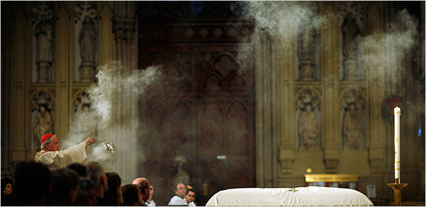 As 750 mourners looked on, a stately rainbow assemblage of more than 150 church dignitaries, including six cardinals, moved in procession past Christmas wreaths and shimmering candles in the nave fragrant with incense. They passed the cardinal’s mortal remains in a coffin draped in a white pall — symbol of the joy of resurrection — and surmounted with a gold crucifix. Then the bishops, abbots, archbishops and cardinals removed their white miters as they headed into the sanctuary, revealing a bobbing congregation of red and purple hats. The journey of Cardinal Dulles to St. Patrick’s was unusual in that this son of diplomats and Presbyterians had been a convert to Roman Catholicism. And, when he was designated a cardinal in 2001 by Pope John Paul II, he was not a bishop or an archbishop, though his voice had been influential in American Catholicism. The cardinal considered his scarlet hat an honorary one, since he was 82 at the time, two years past the voting age in electing a new pope. “The Jesuits loved him,” said the Rev. Ronald J. Amiot, an administrator at Loyola College in Maryland who was one of hundreds who paid respects to the cardinal during a three-hour wake in the St. Patrick’s Lady Chapel before the funeral Mass. The cardinal, Father Amiot added, had been an inspiration to him when he was a seminarian and ever after because “he was a man who walked the walk, and lived what he believed.” An elder statesman of Catholic theology in America, Cardinal Dulles, the son of John Foster Dulles — the secretary of state under President Dwight D. Eisenhower — was a professor of religion for two decades at Fordham. “His extraordinary personal pilgrimage enabled him to be a great conciliator,” said the Rev. Joseph A. O’Hare, Fordham’s former president. During the Mass, mourners, including members of the Dulles family, held program books and the St. Michael Hymnal as they sang “For All the Saints,” which echoed in the great nave. Speakers honored the cardinal’s priestly and academic career, which spanned five decades, during which he wrote 27 books and 800 articles. Cardinal Dulles wrote in later years that he experienced a profound religious moment in February 1939, when, as an agnostic student at Harvard, he made the leap of faith. He described his decision to convert to Catholicism as that of “one of those timid swimmers who closes his eyes as he jumps into the roaring sea.” He shocked his family and friends the next year by converting. He joined the Society of Jesus in 1946 and was ordained as a priest in 1956. Cardinal Dulles became a conservative theologian in an era of liturgical reforms and rising secularism, rallying to the defense of the pope against demands for change, and giving uncompromising loyalty to an American church that had been wounded after covering up hundreds of cases of sexual abuse by priests and suffering the loss of tens of millions of dollars in lawsuits as a result. Aside from his academic persona, Cardinal Dulles “was a priest’s priest,” said the Rev. David S. Ciancimino, the provincial, or head, of the New York Province of the Society of Jesus, terming him a modest man who “shunned the limelight.” Cardinal Egan fondly recalled the years he had known the tall, self-deprecating Cardinal Dulles, whose angular face was often likened to that of a beardless Abraham Lincoln. He said that Cardinal Dulles knew well the suffering of ordinary parishioners. Indeed, during the last phase of his life, due to the recurrence of the severe polio he contracted while he served in the Navy during the Second World War, Cardinal Dulles “was confined to a wheelchair and rendered unable to speak,” Cardinal Egan said. After the Mass, the wan late-afternoon sun, which had returned for the day to Manhattan, made the church dignitaries’ miters and gold-threaded vestments gleam as the procession escorted the coffin down the steps to Fifth Avenue from the warm cathedral into the brisk afternoon and a waiting hearse. And spontaneously, the crowd of hundreds at the bronze doors applauded. |