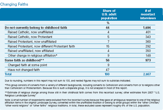 Catholicism has suffered the greatest net loss in the process of religious change. Many people who leave the Catholic Church do so for religious reasons; two-thirds of former Catholics who have become unaffiliated say they left the Catholic faith because they stopped believing in its teachings, as do half of former Catholics who are now Protestant. Fewer than three-in-ten former Catholics, however, say the clergy sexual abuse scandal factored into their decision to leave Catholicism. In contrast with other groups, those who switch from one Protestant denominational family to another (e.g., were raised Baptist and are now Methodist) tend to be more likely to do so in response to changed circumstances in their lives. Nearly four-in-ten people who have changed religious affiliation within Protestantism say they left their childhood faith, in part, because they relocated to a new community, and nearly as many say they left their former faith because they married someone from a different religious background. The new survey is a follow-up to the "U.S. Religious Landscape Survey," conducted by the Pew Forum in 2007 and released in 2008, and is based on recontact interviews with members of the largest segments of the population that have changed religious affiliation. This includes more than 300 interviews each with former Catholics who are now unaffiliated, former Catholics who are now Protestant, former Protestants who are now unaffiliated and those raised unaffiliated who now belong to a religious faith. The survey also includes nearly 300 interviews with people who have gone from one denominational family to another within Protestantism and nearly 1,000 interviews with people who still belong to the group in which they were raised. In total, the new survey allows for in-depth analysis of about eight-in-ten of those who now have a different religious affiliation than the one in which they were raised.2