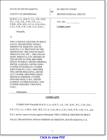 | Nun Abuse at Hell's Orphanage By Matt C. Abbott Renew America August 14 2010 http://www.renewamerica.com/columns/abbott/100814 Although I'm a staunch, orthodox Catholic, I still consider myself an advocate for clergy/religious abuse survivors, for which I make no apologies. I was able to attend the opening session of the 2010 Survivors Network of Those Abused by Priests (SNAP) conference. It was a somber experience, and it made me realize how difficult it would be if I had ever been abused by a priest or nun — and no, I'm not talking about getting hit on the wrist with a ruler — to remain a practicing Catholic. I love the Church and will, with God's grace, remain faithful to her teachings until the day I die. But I do have great sympathy for the survivors, even if they've abandoned the Church as a result of what they experienced. (Of course, I don't have sympathy for those who bash the Church simply because they want to continue living an immoral lifestyle, be it heterosexual or homosexual.) We've read, and heard, a lot about clergy abuse in recent times, but not so much about abuse by religious. Yet such abuse has happened to a number of people over the last several decades, and it shouldn't be overlooked. Below is the full legal complaint against the Diocese of Sioux Falls, the Tekakwitha Orphanage for Native Americans, the Oblates of Mary Immaculate, and the Sisters of the Divine Savior. In the lawsuit — you can read a recent newspaper story about it here — several religious, in addition to the priests, are accused of sexual, physical and mental abuse against the plaintiffs. The allegations are sickening, and, due to the frank descriptions of the alleged abuse, reader discretion is advised. Pray for those who have suffered physical, sexual or mental abuse during the course of their lives.