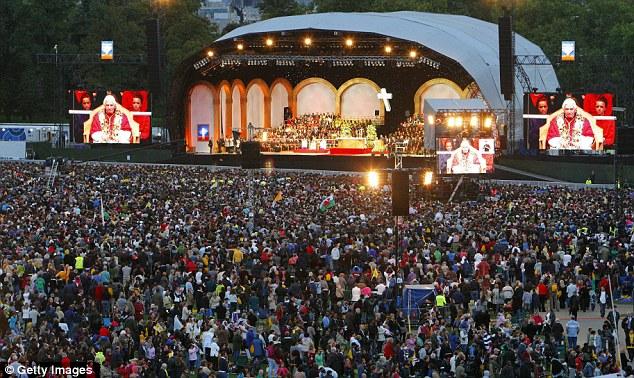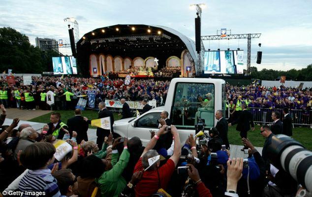 In the crowd, sister Maria Natella, 54, of St Dominic's Priory in Lymington, Hampshire, was moving to the music, beaming with happiness. She said: 'It's just amazing, I can't put it into words. 'To have the Holy Father here is a historic occasion. Every word he has spoken has been one of encouragement to Catholics and Christians.' Earlier today the Pope apologised for the 'unspeakable crimes' committed by Catholic priests who sexually abused children. Speaking during a packed service at Westminster Cathedral, he expressed his gratitude for the efforts being made to tackle the problem of child abuse among the clergy. The service came after he met with Prime Minister David Cameron before the service as he began the third day of his UK tour.